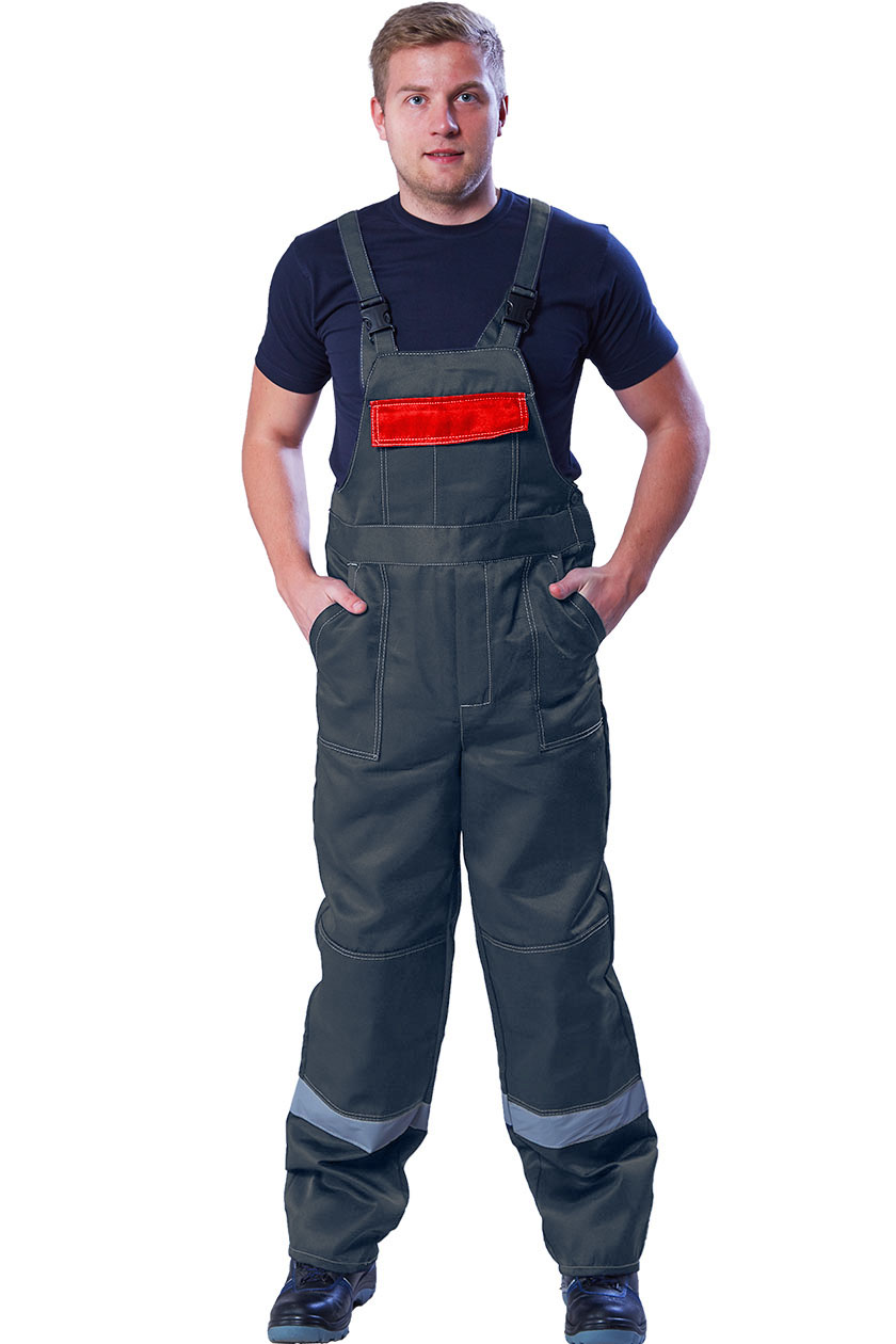 ➠ Полукомбинезон: застежка гульфика на тесьму «молния», застежка в боковом шве на пуговицы. Накладные карманы по бокам с наклонным входом, на грудке карман с клапаном. В области коленей усилительные накладки. На правой задней половинке накладной карман. По низу брюк СОП 50 мм.